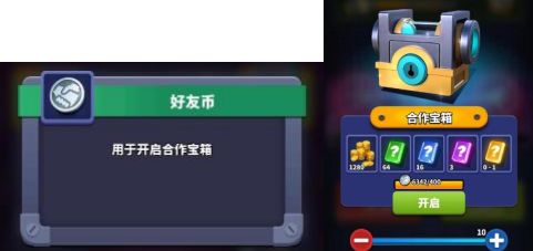. 合作宝箱:主要通过合作模式来获取,在合作模式中达到一定关数会获得一定的合作币,每 40 个好友币开 一个宝箱,有一定概率开出传奇装备。