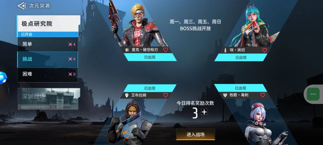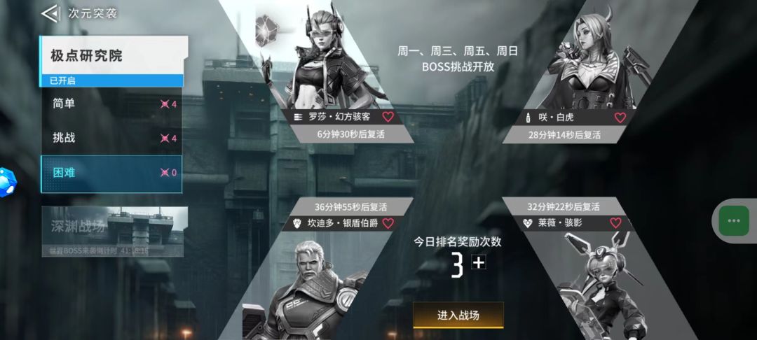 次元突袭分为【简单】、【挑战】、【困难】三种模式,每种模式都设有四个人物挑战,每个boss掉落的物品也不一样,每逢周一、周三、周五、周日开启战斗哟~