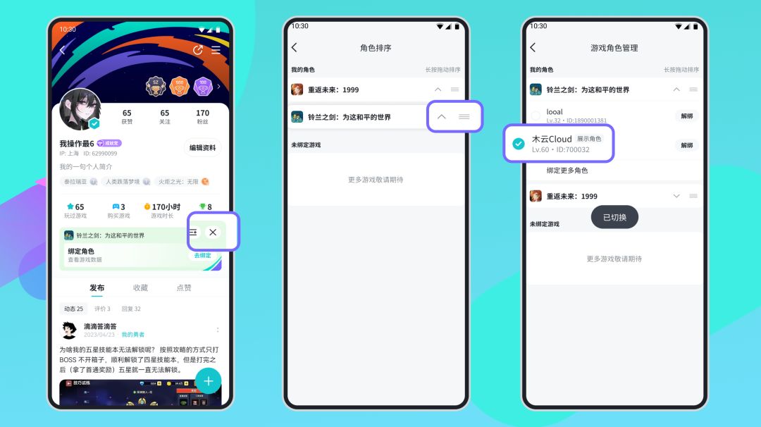 同时绑定了两款游戏以上的 Tapper 可以在 个人主页 >> 游戏身份卡片>>右上角设置 中根据自己的偏好长按拖动去 排序角色 位置,优先展示你最喜欢的卡片。未绑定的游戏卡片也支持关闭啦,关闭后可从游戏角色管理界面中,再次进行绑定。
