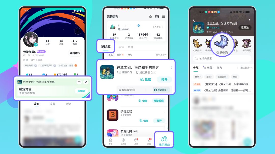 - 另外,我们还开设了 2 个固定入口,可以直接在 游戏论坛推荐位 使用查询,也可以前往 我的游戏>>游戏库>>游戏身份卡片 上点击查询。