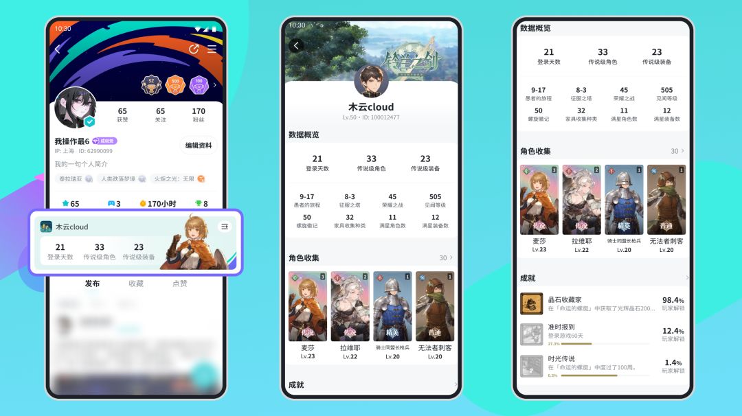 你可以在数据详情页中查询角色信息、数据概览、角色收集等,本次我们把 成就 也搬进到了数据大家庭, Tapper 可以展示在游戏内获得的最稀有的三个成就,未来我们还会持续增加多元化的数据展示。