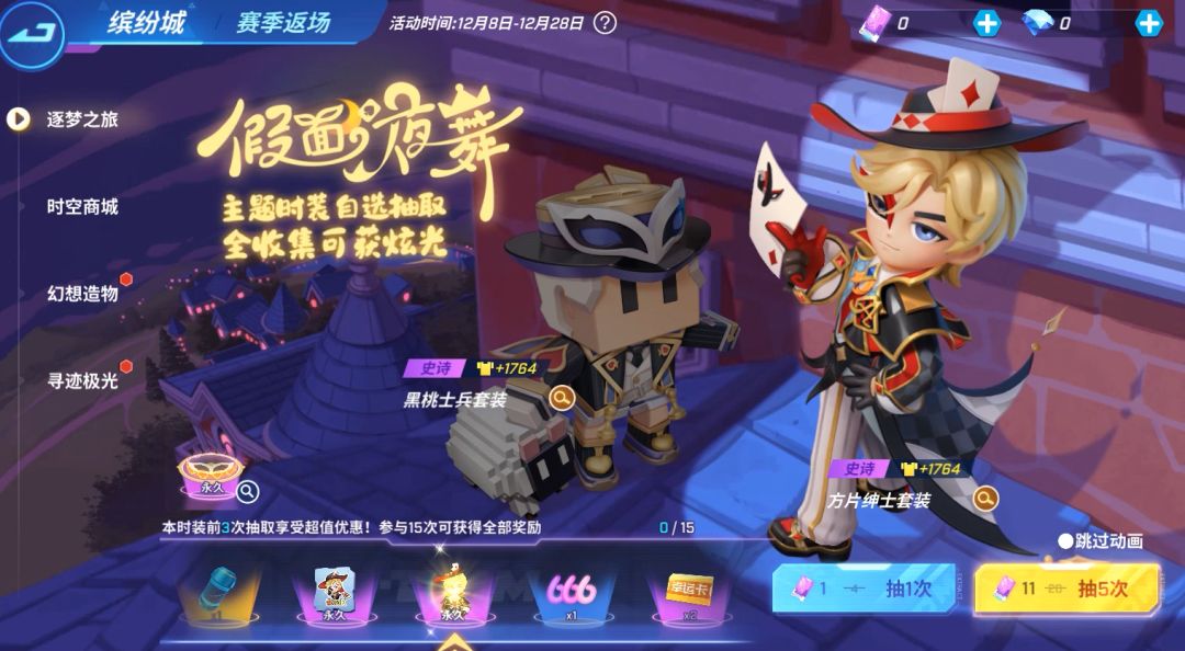 逐梦之旅再次开启!【魔术师·黑桃士兵套装】、【发明家·方片绅士套装】上线啦,少年们可自选喜欢的时装进行定向抽取,当收集齐两套时装后还可解锁【炫光·惊喜预告】哦~