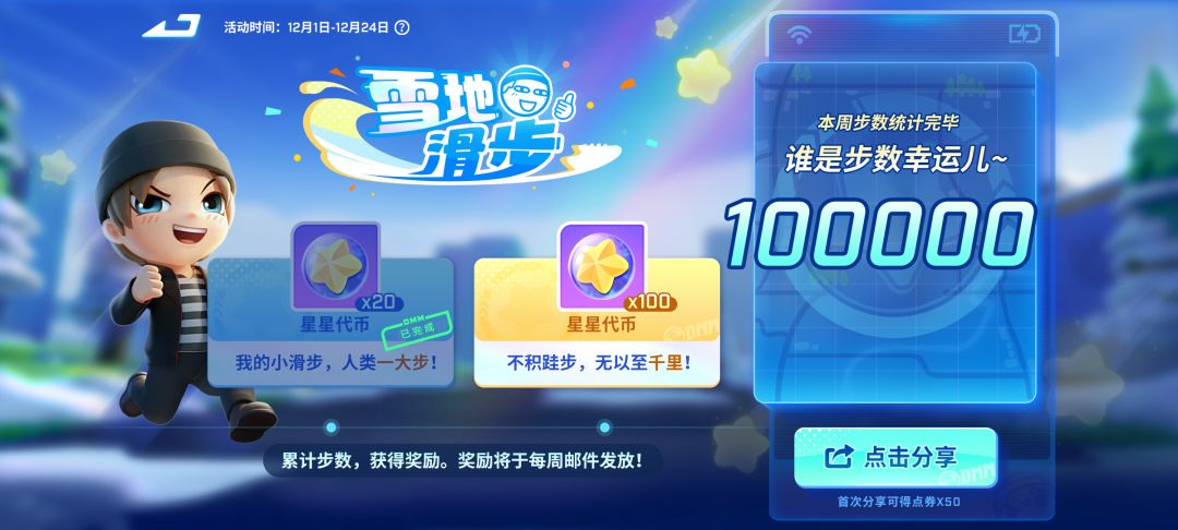 活动期间,在4v1,8v2雪地上跑一跑,小学妹随即就会记录你的步数!达到对应步数后,就可以赢取丰厚的星星代币,换取多重好礼啦~