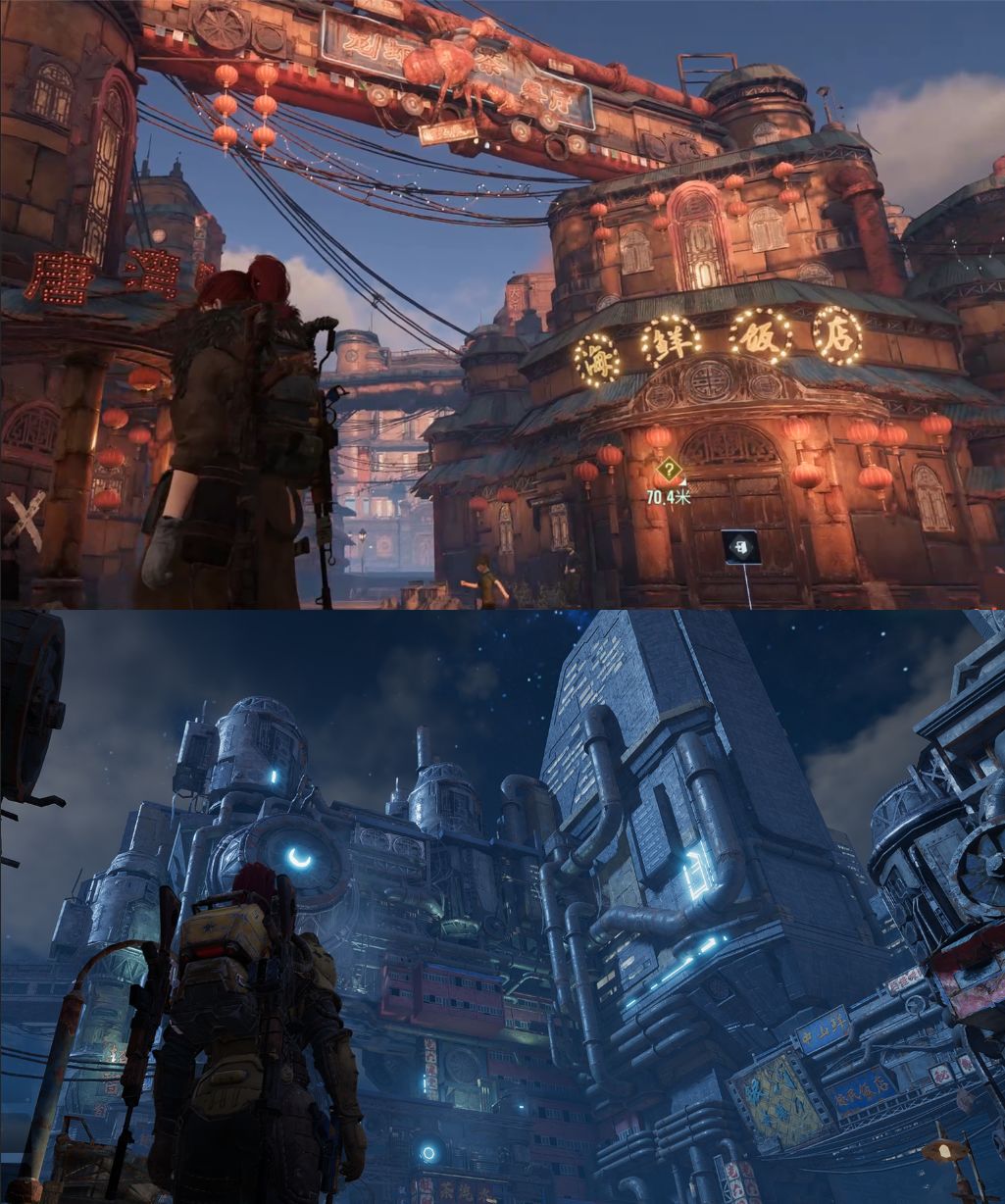 游戏中的大部分环境虽然都是一眼望不到尽头的废土,但当进入主城后,风格化就凸显起来了。建筑的设计以及角色的着装就像是蒸汽朋克与民国风的混搭,带给人一种十分新奇的复古感。