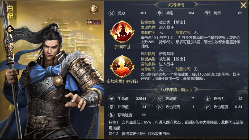 “杀神”白起,不以攻城夺地为唯一目标,而是以歼敌有生力量作为主要目的的歼灭战思想,而且善于野战进攻,战必求歼。伊阙之战斩杀韩魏联军24万。攻楚三次,攻破楚都,烧其祖庙,共歼灭35万楚军。攻赵先后歼灭赵军60万(含长平之战)。携带兵种盾兵,方阵血量低于65%,可进入固守状态,此期间无法使用技能。减少来自弓箭手、弩兵、弓骑兵的伤害30%,高防御的同时攻击也不低,加上有技能BUFF加持,活着简直就是个BUG的存在。