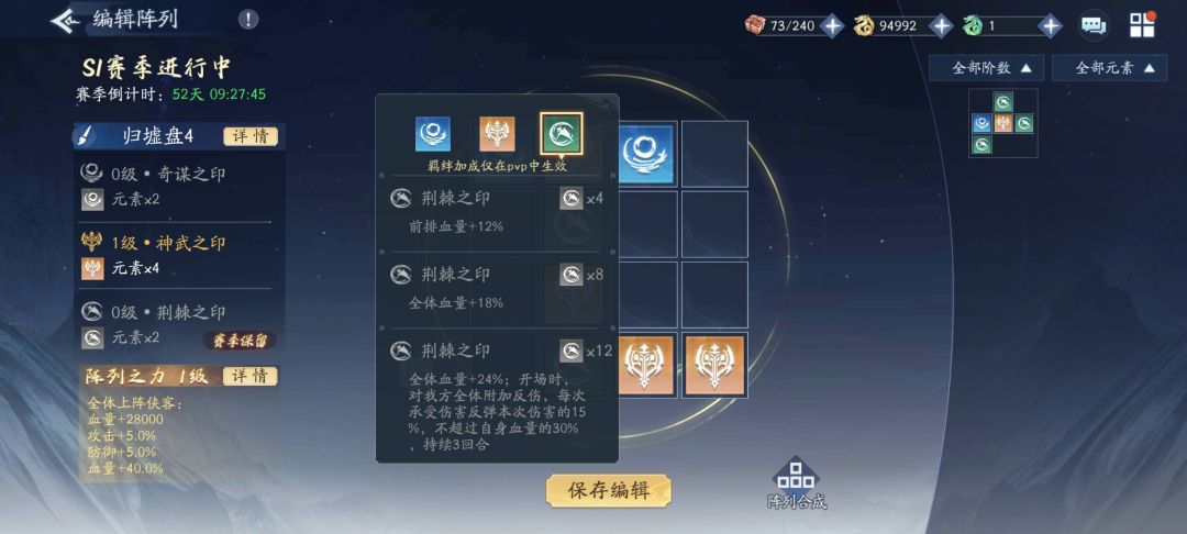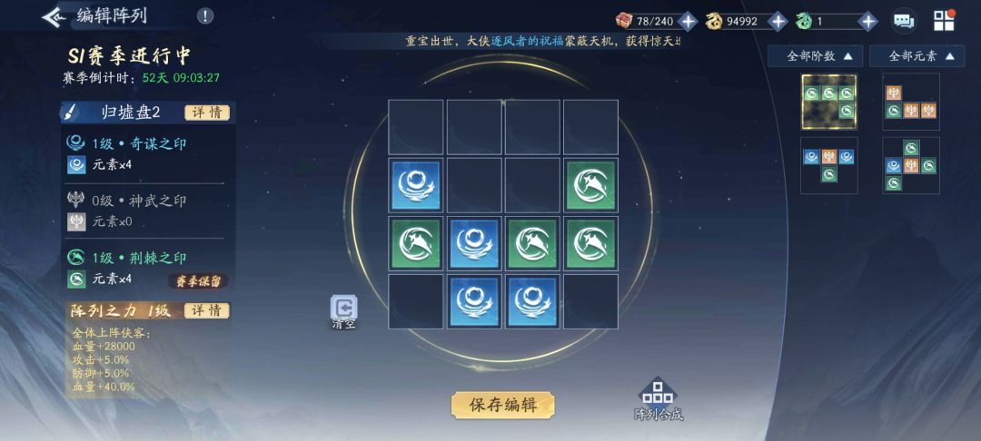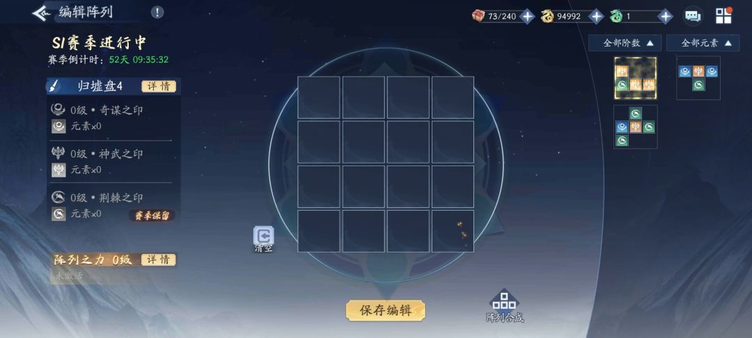 归墟盘右侧为阵列之力选择,可以自由组合,类似于七巧板的拼装。