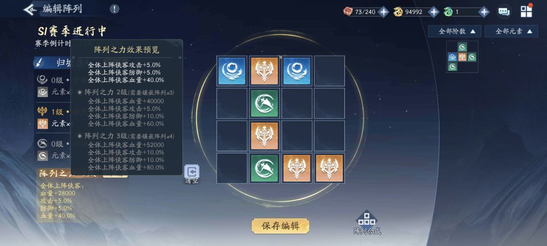 根据归墟盘中填充的阵列之力数量来划分等级,分别增加全体上阵侠客的血量固定值和攻击、防御、生命三项的百分比,加成非常可观。