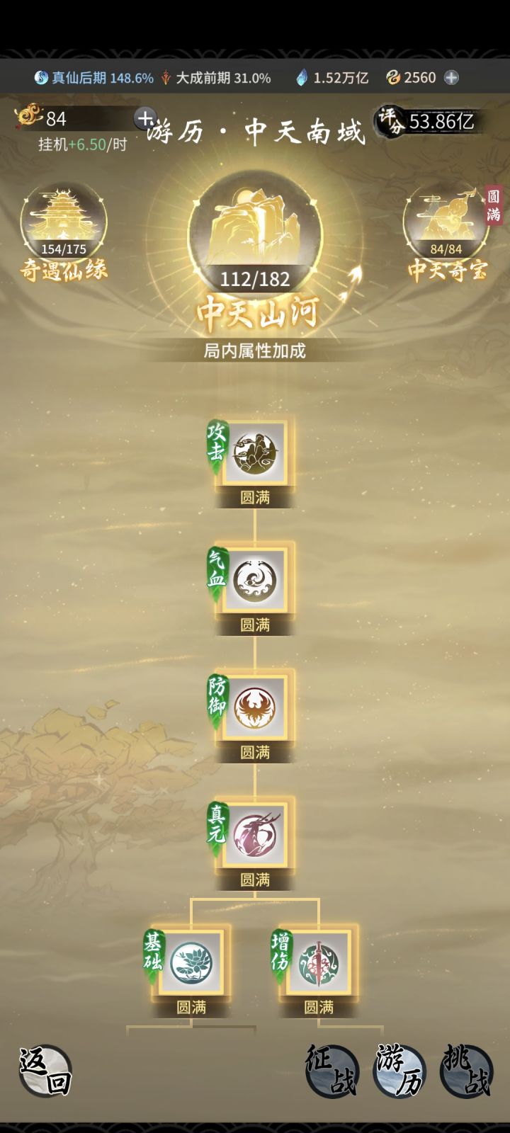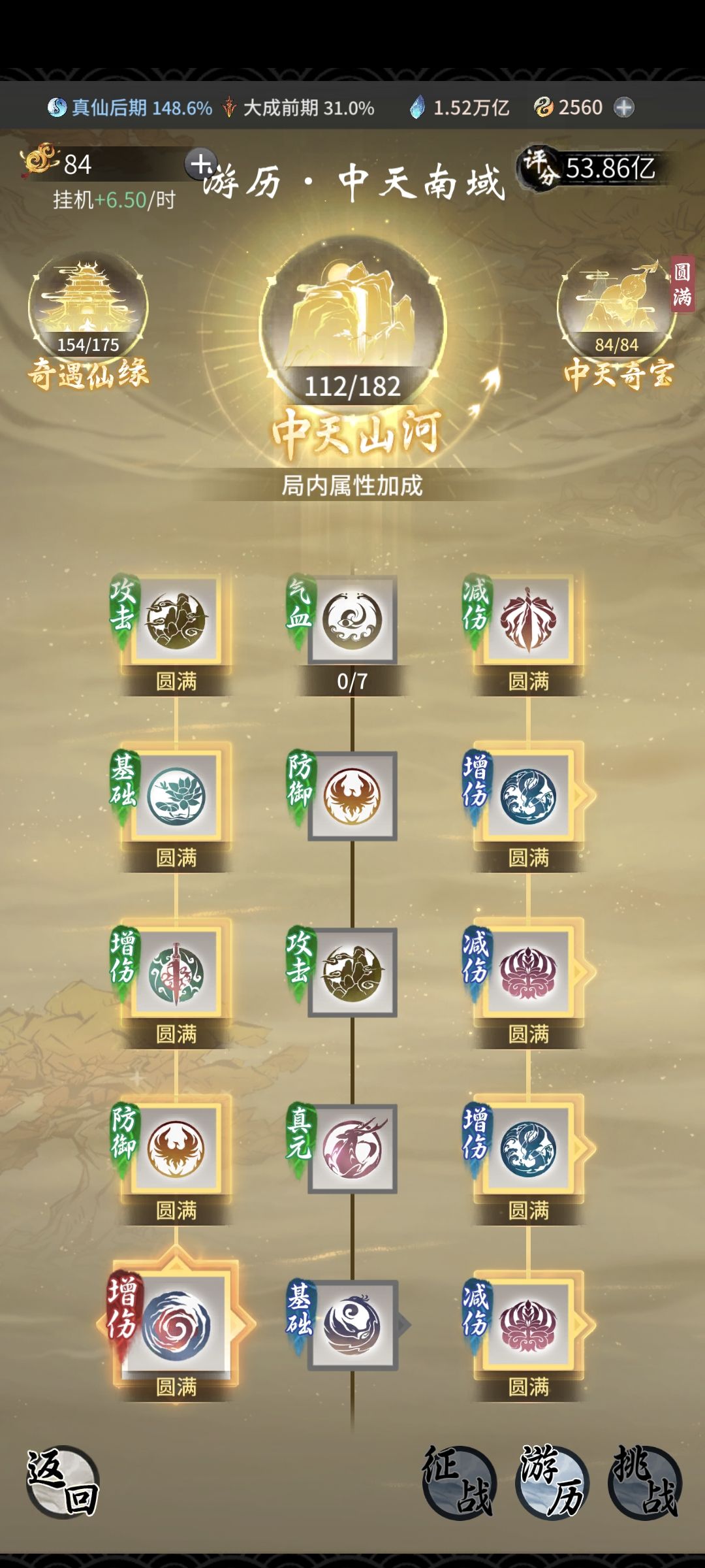 最后的中天山河:加征战南域关卡的属性,通关50关可以拿到中天三绝古宝套装 (加洞府灵气5%)而大部分修为一梯队账号如果没点的话,那打到27关左右就会很难打下去,除非高氪账号 没点前期打到45 还是有希望的。46关开始难度增加 ,后面就需要仙界神通 最好群伤的进行通关操作 中天山河详细加点 可以通过自身的账号属性 来调整 比较标准的,适合大部分玩家的点法如图:左右两边的增减伤害都点出来,大部分账号都能打满60关了。自身属性比较高的账号 可以在不点 到112之间选择即可,加点顺序 右边点到增伤 之后根据实际情况 是抗不住还是伤害不够 来选择点左边的增伤 还是继续点减伤。