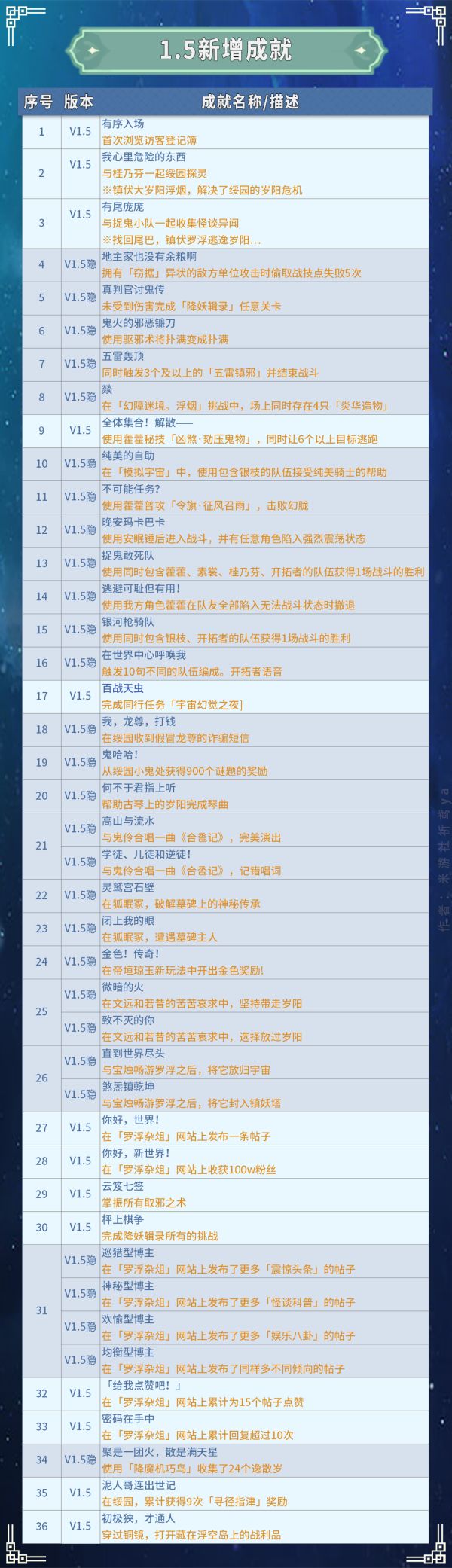 大家好呀,这篇内容写一下1.5版本新增的成就,及其攻略注意事项:(1)截止1.5版本,成就共531个,版本新增36个(2)新增成就一览成就列表