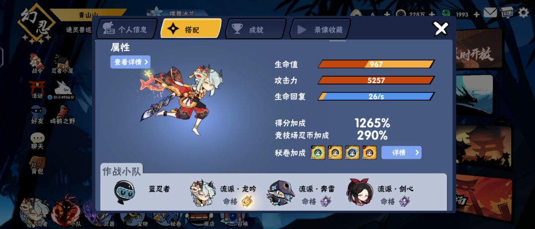 ②洛清首发,双毛笔(清弹幕,攒能量),3勾忍宗+3勾墨髓+S雷手里剑+3勾专属,两个大打到14血😊。