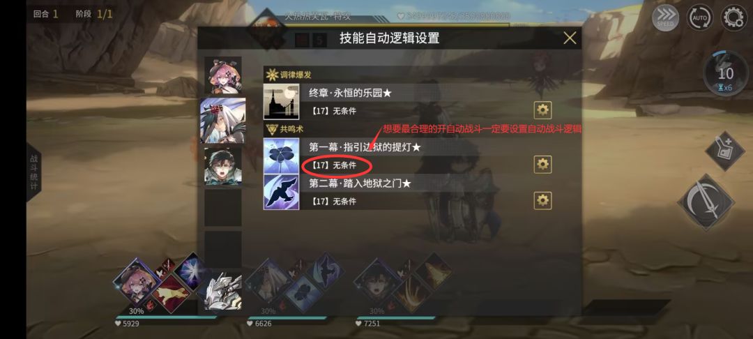 最后是自动战斗。系统默认的逻辑是不合适的,我们需要手动调节一下。下方数字是技能释放顺序,如果不懂怎么调那听我的,无脑把所有给BOSS的负面buff放到1、2上,增益我方的buff放到3、4上,输出型技能放到5、6,最后是特殊效果型如刷新技能CD等放到7、8上。