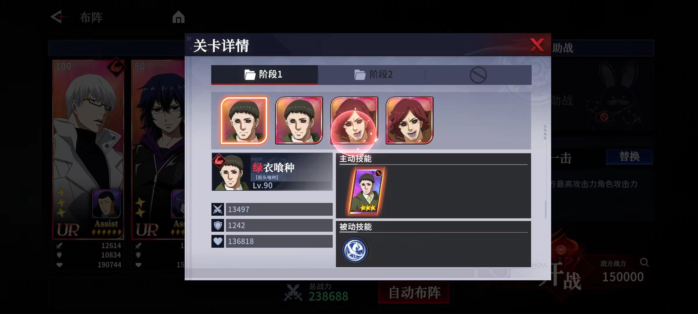 阶段一:4个小怪,两个绿衣喰种(Lv90)、两个红发喰种(Lv90),被动技能均附带免疫技能限制。因为PVE的被动均挂上免疫技能限制,所以该关卡只能够实打实的通过输出结束战斗。由于该关卡阶段二为3个角色,所以无论选择点杀式战队亦或者AOE式战队均能输出最大化。