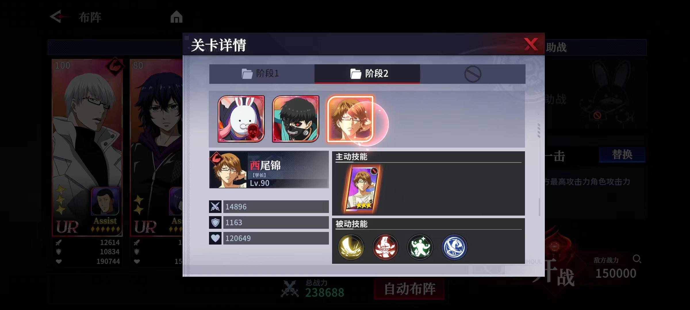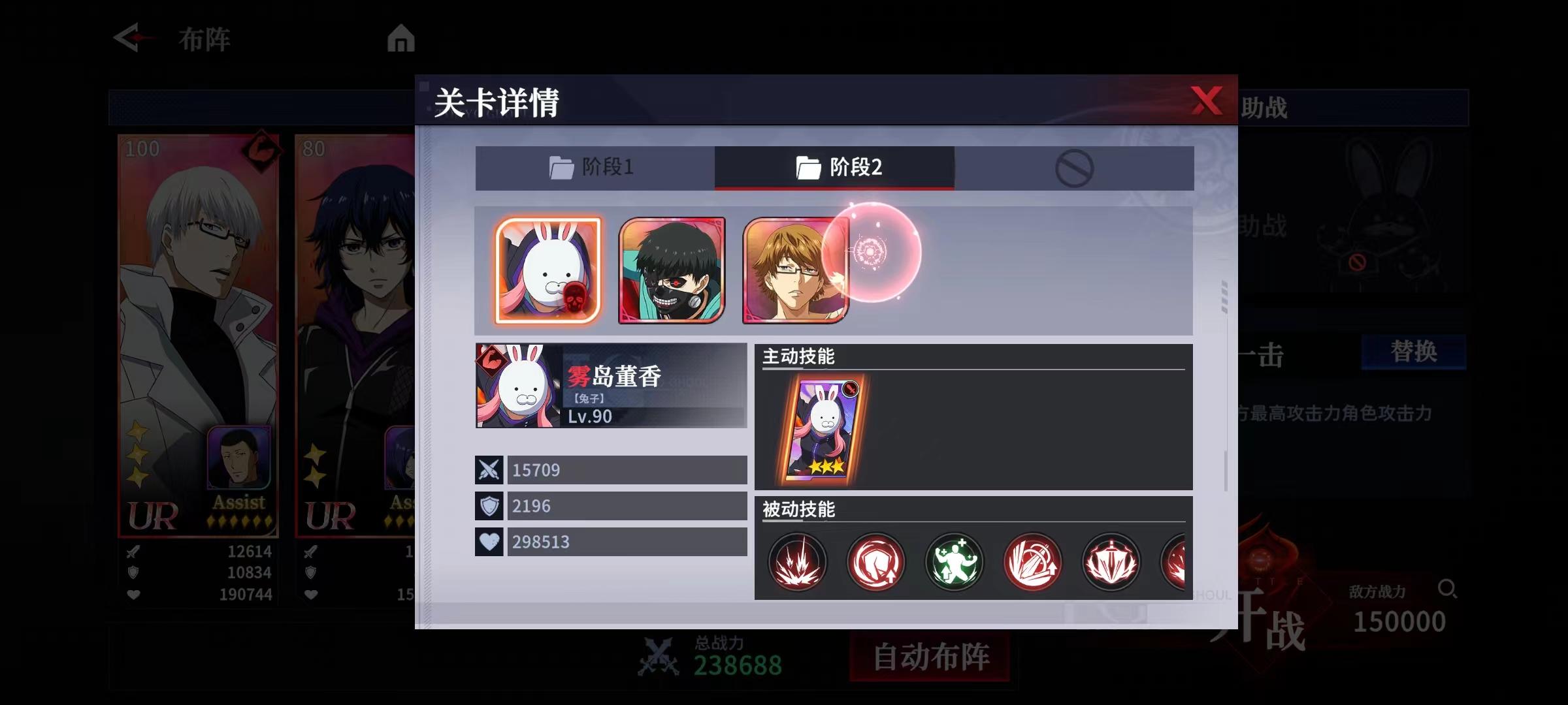 阶段二:主BOSS雾岛董香【兔子】,两个副手分别为金木研【爱读书的青年】、西尾锦【学长】。雾岛董香【兔子】免疫Weak眩晕和免疫所有控制效果以及技能等级下降效果,金木研【爱读书的青年】、西尾锦【学长】均免疫技能限制。3个角色均拥有免疫技能限制被动效果,类似雾岛董香【赤焰孤翼】、富良太志【老练的搜查官】、大守八云【杰森】等挂状态或定点打击的角色均失效,所以切记看好关卡详情后再搭配战队阵容。
