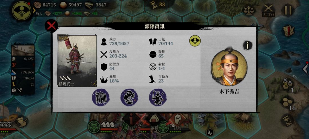 兵种技能:勇氣Lv3與兵力數大於我軍的敵軍交戰時,暴擊概率+35%