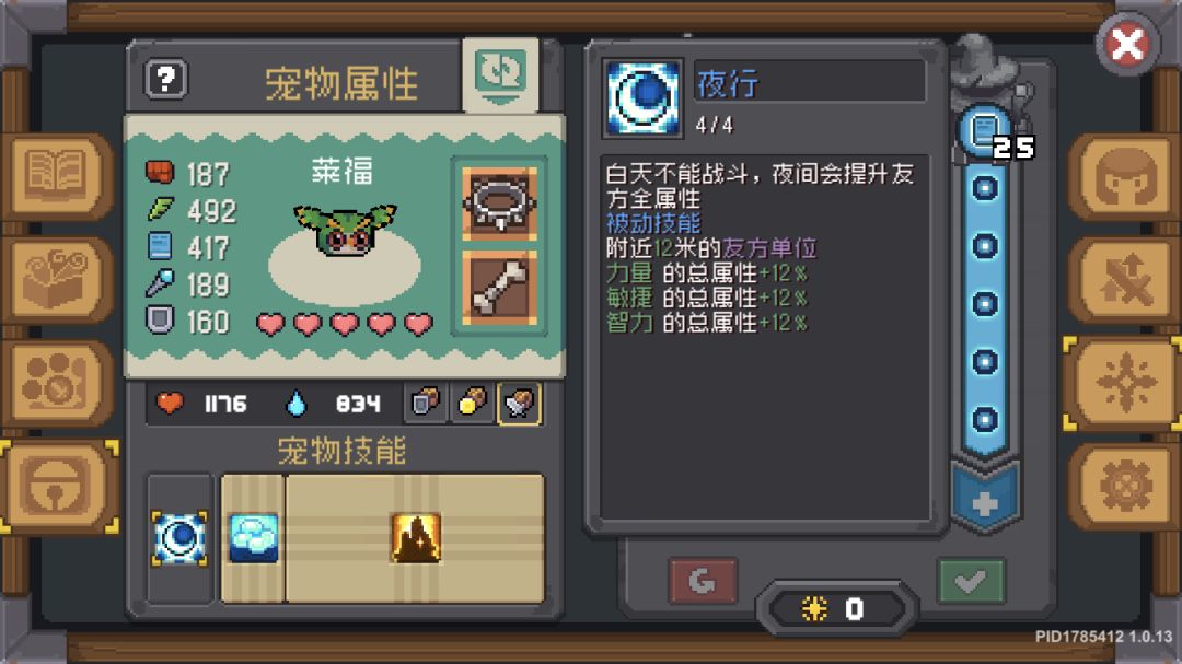 宠物的话我用的猫头鹰,它的被动是夜晚给全属性光环(白天不给,但是能用技能)非常nice,技能方面如图,我学的减益抗性光环,还加移速
