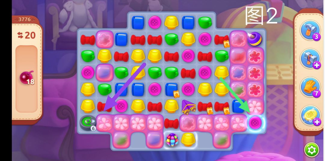 我们再看下图2,紫色箭头标识的就是吸尘器,绿色箭头标识的就是充电站。那么,我们来看看,吸尘器是绿色的,并且数量写的是6,那么我们可以配对一些绿色的元素。或者用加速道具来也可以消除绿色元素,收集到6个以后,吸尘器会一下子通往下一个绿色箭头标识的充电站,与之同时,这一横排的元素会全部被清除哈!
