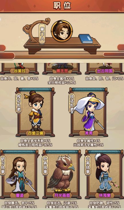 打开大殿-职位界面,我们可以设置弟子不同职位来增加各种属性,战斗属性优先给上阵弟子,有采集、研习加成的职位可以给效率高的矿工弟子。