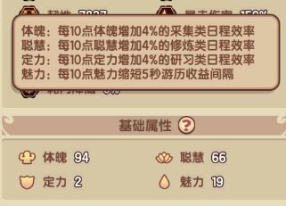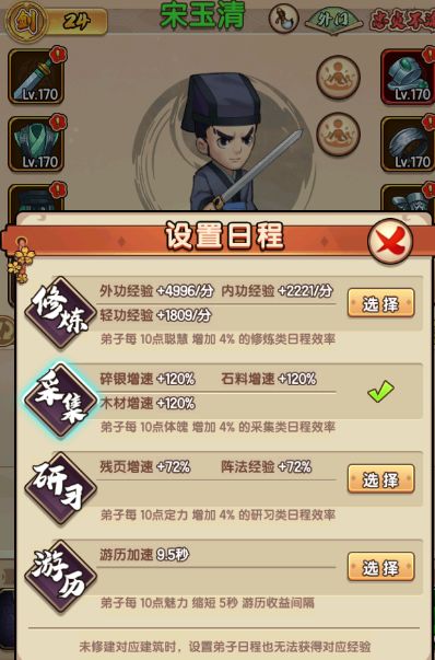 由于每个弟子初始的基础属性(体魄、聪慧等)不同,这些基础属性还影响日程效率(如图),所以我们可以根据弟子本身的属性情况来进行日程安排,例如小宋本身体魄高,我们就安排他进行采集类日程任务(如图)。可以给弟子喂食一些多余属性丹药增加他的日程效率。