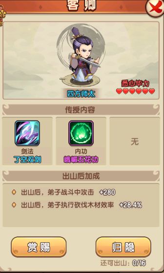 我们在招募一些客卿时他们会提供一些不同的资源或修炼加成(前提是该客卿出山状态),通过赠送客卿礼物来提高加成,这里建议赠送喜好物品。