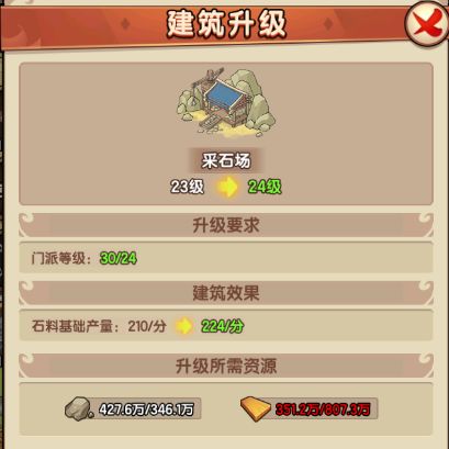 基础产量主要是根据石矿、木矿的数量和等级,武学残页基础产量对应的建筑是藏经阁、阵法研习基础效率对应的建筑是阵法堂。基础产量很重要,是后面这些产出加成的基数,建议优先提升。涉及石矿、木矿升级时还要注意一下主矿和副矿的升级经验不同,我们在升级时可以对比下两个矿之间增加产出与升级所需资源的具体情况来确定优先升级哪个。