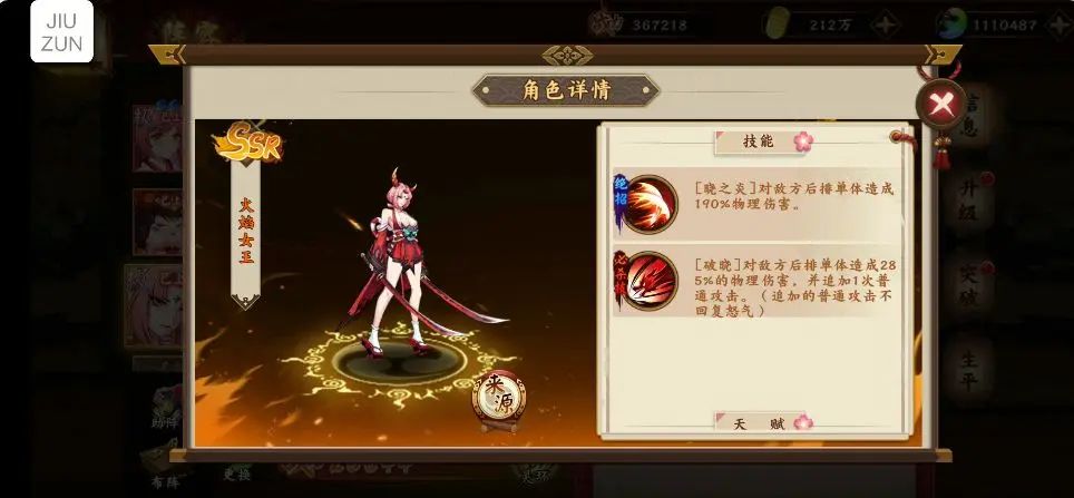 技能绝招:【晓之炎】对敌方后排单体造成190%物理伤害必杀技:【破晓】对敌方后排单体造成285%物理伤害,并追加一次普攻