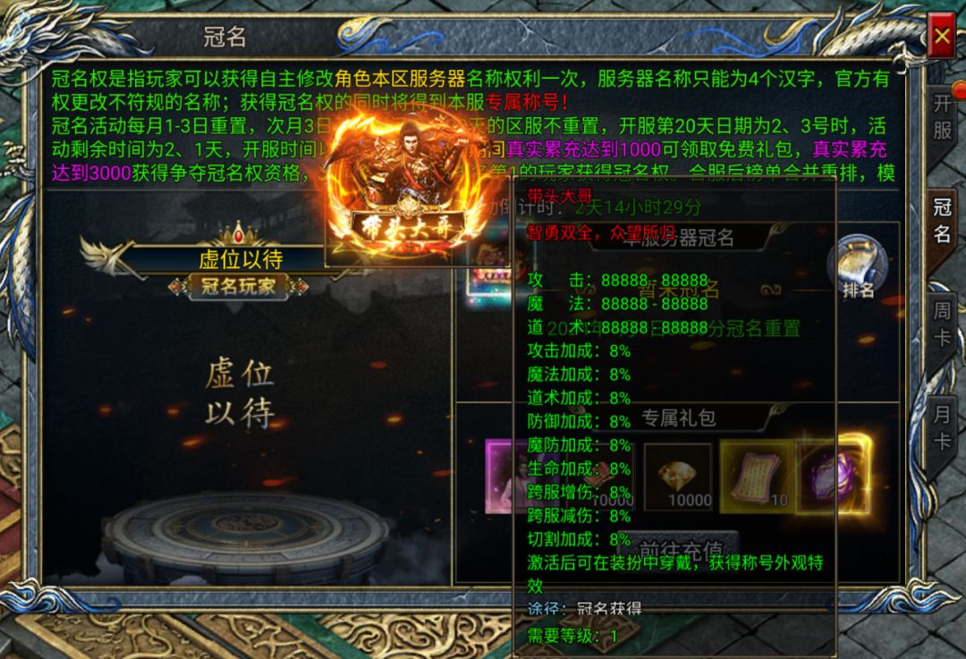 冠名活动每月1-3日重置,次月3日开服时间小于20天的区服不重置,开服第20天日期为2、3号时,活动剩余时间分别为2、1天,开服时间以主服为准。活动期间真实累充达到1000可领取免费礼包;真实累充达到3000获得争夺冠名权资格,活动结束后充值排名第1的玩家获得冠名权。合服后榜单合并重排,模型展示重排后的榜单第1名。