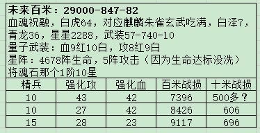 Floatiy老哥用的是攻魂,因为我没有最合适的黄忠和黄月英,只有满配的祝融,所以单独写一个血魂方向未来打百米的攻略,差不多精10有1万出战就能打,32E打完64E之前可以搞这个,64E没啥好奖励,百米先打了,不论是紫果还是百米寻宝东西都还行