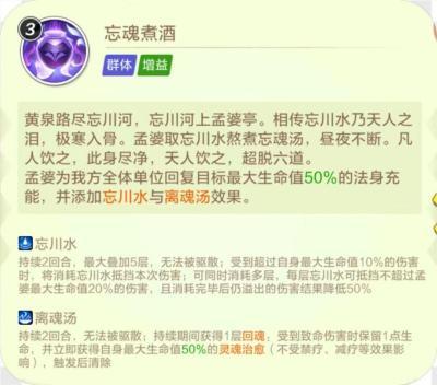 一技能忘魂煮酒为我方全体加50%法身,同时附加可以抵挡伤害的忘川水和带有受到致死伤回复50%血量的离魂汤。这里要说明下,离魂汤的回魂效果,优先于金身触发,回魂都触发完以后,才会触发金身,金身消耗完挂掉以后会触发轮回镜,进入游魂状态。游魂状态下再获得回魂是会翻倍的,开局怒气技能获得的回魂因为是正常状态,所以不会翻倍。