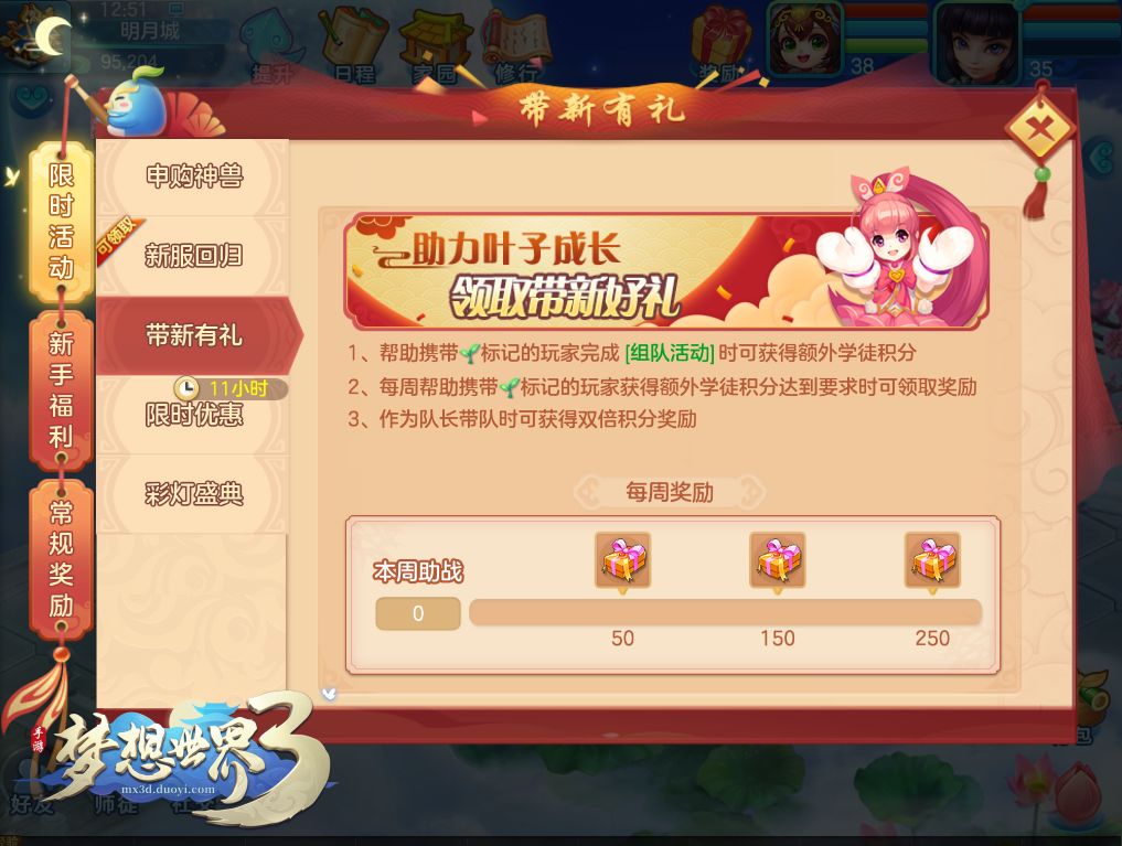 新服开服前4周开启在线礼包活动,活动期间内当天累计在线5分钟、15分钟,可各获得1份在线礼包。每天首次登录时刷新,最多领取3天奖励。