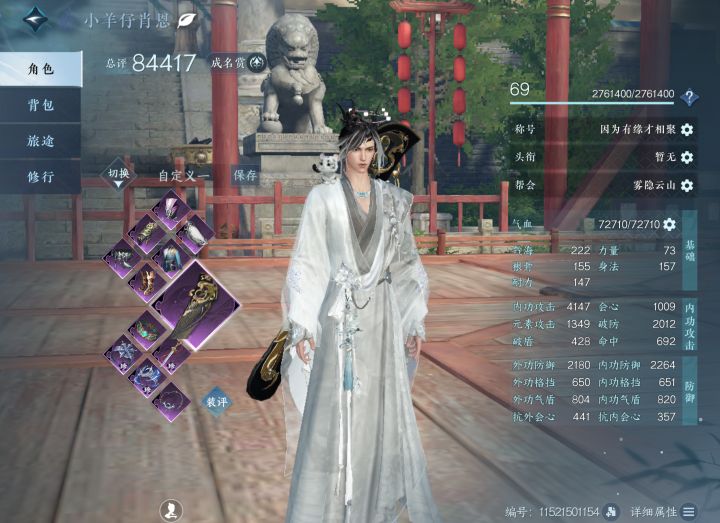 装备方面,昨天更新后,优先保证77,79四件套,如果有镜天阁老一的腰带带上,没有的话剩下的部位带宣夜袖子(我这样带),衣服楚相玉终于可以换了,带新的加攻击和根骨衣服。首饰部分,有两件套可以带两件套,剩下部位带丹心百战归(如果命中特别不够带牧野弥项链),没有两件套还是上月痕。戒指目前是谪仙戒和千仞戒指。
