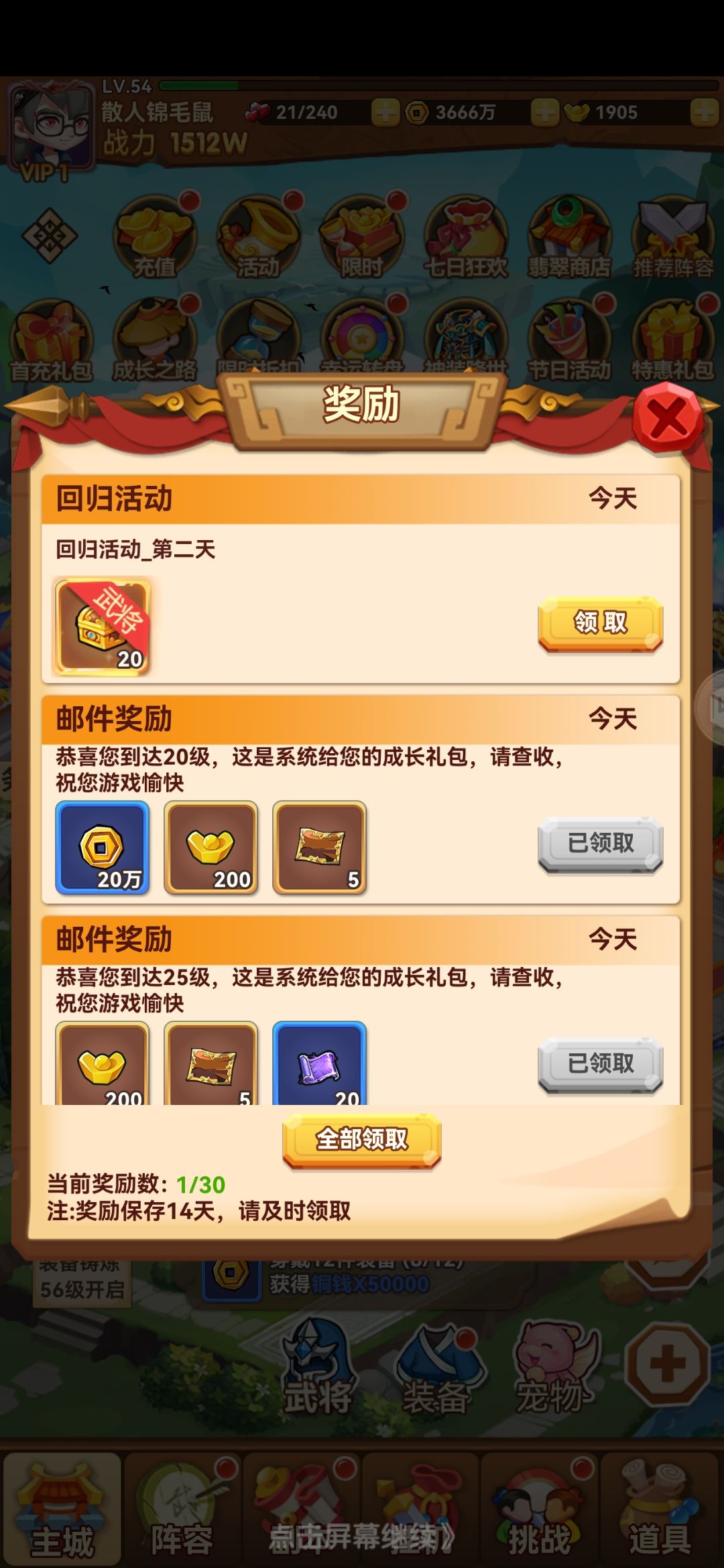 4.推图,推图,还是推图,推到打不过没有体力为止!单将流推普通关卡至少2星(主角比较菜,可以给适量防御装保命),推精英关卡完美3星(战损2以内都是满星)拿到的元宝只买体力(包子)+快速挑战令