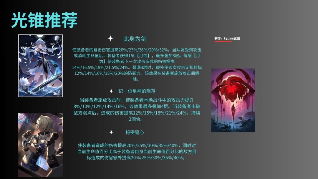 首选角色专武光锥,任何一版本的新上角色,配比最高的必然是专武。如果星穹有限无力支撑专武的话,替代五星记一位星神的陨落,虽然提攻提伤,但没有了专武烧血的加成属性,无视防御属性,可以说是大大折扣。其次,烧血机制的专武就是阿兰的秘密逝心,但4星光锥的容错率还是不如五星的黑塔商店的星神陨落!这点根据大家喜好自行判断!