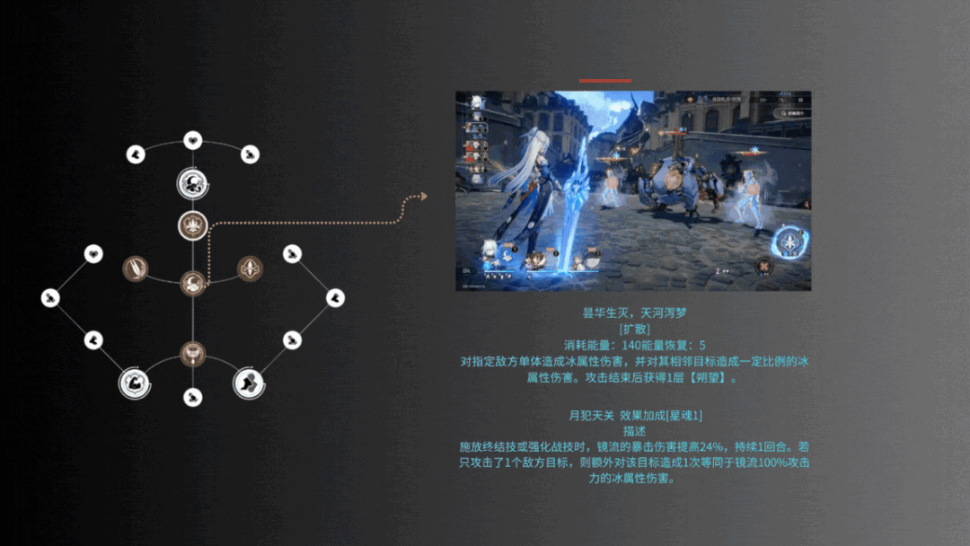 消耗能量:140能量恢复:5对指定敌方单体造成冰属性伤害,并对其相邻目标造成一定比例的冰属性伤害。攻击结束后获得1层[朔望]。