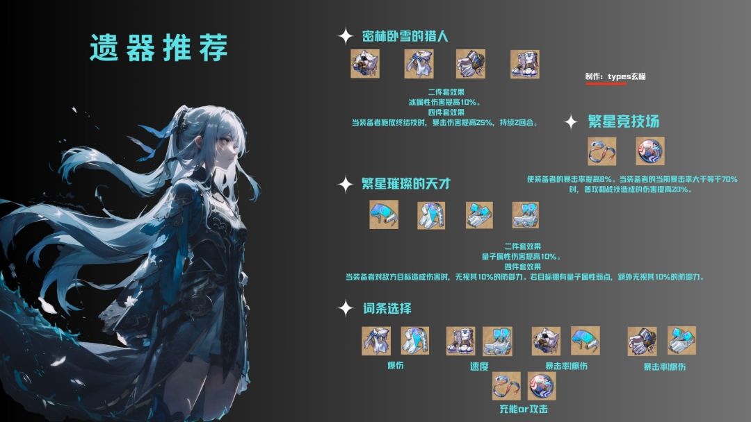 由于镜流的特殊性,版本遗器的容错率并不是全都适合自身过硬的体质,也没有相对而言非常适用的遗器。自身冰属性伤害的冰套密林卧雪的猎人2件套提升冰系伤害10%,四件套提升爆伤25%。可以说是不错的选择。同理自身忽视防御的体系,量子套也非常适合镜流,两件套提升量子属性伤害10%,4件套忽视10%的防御,额外量子属性弱点外加10%的忽视属性。相对而言量子套在加10%忽视的属性下,需要特定条件。两者伤害输出相差不大,微乎其微。最后还有散装,四件套堆叠爆伤,针对天赋BUFF进行压榨,所以镜流的配装不是在增伤,就是在增伤的路上。上下限收益无法达到最大值。至于绳球选择,就是充能与攻击(带速度)。能够保证镜流场上持久续航和开大能力。词条选择:爆伤衣,速度鞋,暴击或爆伤头,带有暴击或者爆伤的手套。抽取建议