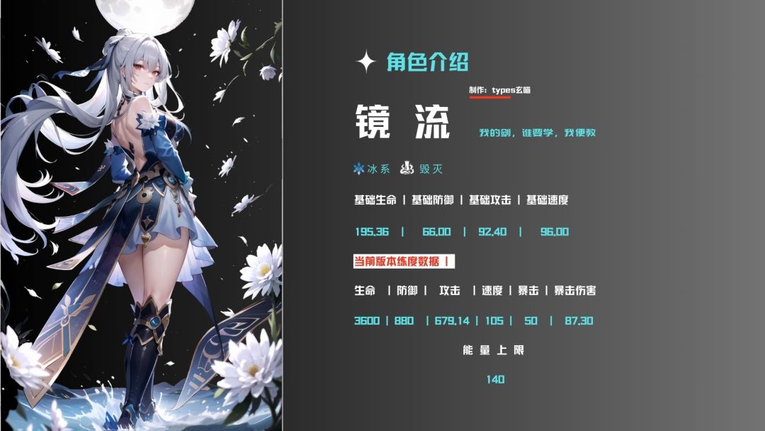 当前版本练度面板属性:生命:3600,基础防御:880,攻击:679.14,速度:105,暴击:50,暴击伤害:87.30,能量上限:140。