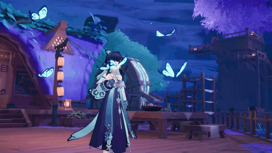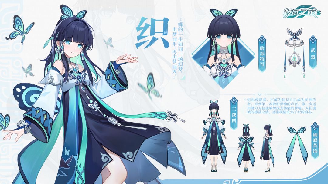 在织的服饰上,还随处可见大量的蝴蝶相关元素。除了较为明显的蝴蝶头饰、袖口上的蝴蝶纹理之外,织的背饰更是设计上的点睛之笔;背饰的设计则直接采用了蝴蝶翅膀的样式,使得织从整体上看,就好像身后有一对蝴蝶翅膀一般灵动。除此之外,背饰的下摆采用了飘带的形式设计,为织多增添上几分飘逸、轻灵的元素。
