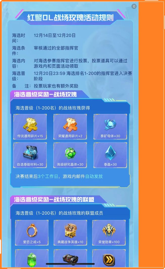 《红警OL》“战场玫瑰”年度竞选划三大阶段,报名阶段持续11天,海选阶段持续7天,决赛阶段持续8天。美女指挥官报名参加活动并审核通过,即可入围【海选】;海选阶段获得投票最多的前200名美女指挥官,即可入围【决赛】。