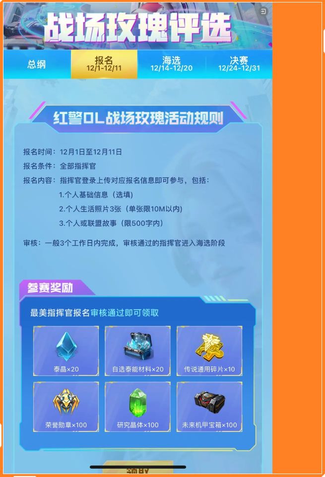 《红警OL》最美指挥官之“战场玫瑰”竞选,划分为【报名】、【海选】、【决赛】三大阶段;