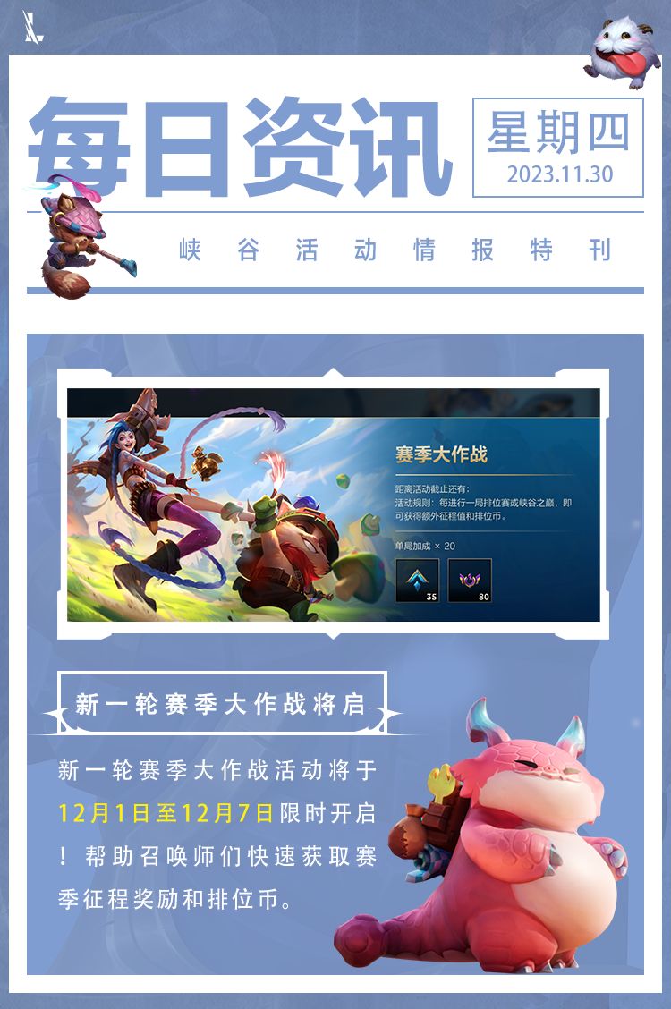 赛季大作战将于12月1日至12月7日限时开启,活动期间,完成相应活动任务可获得额外的排位币和征程值与奖励~