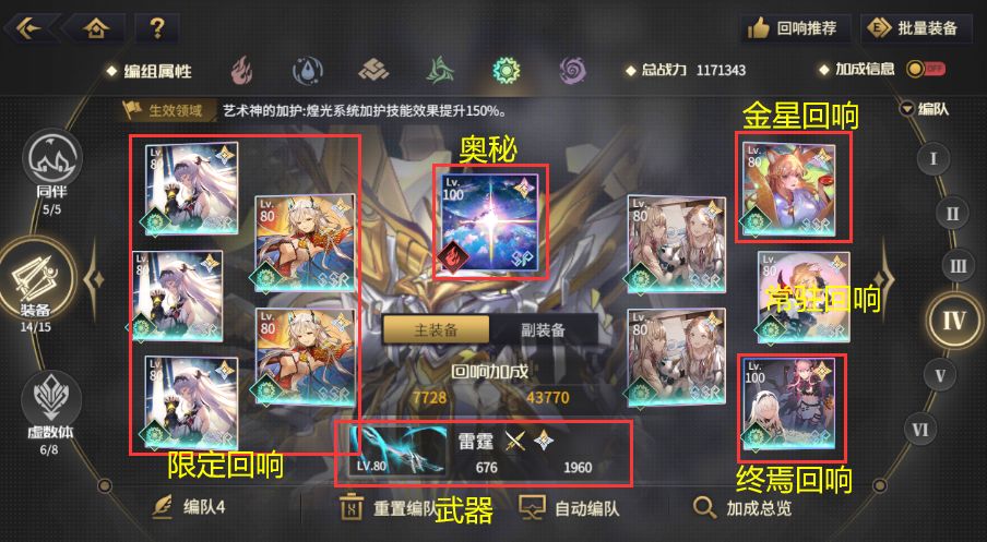 悠久之树的回响都有自己的属性,装备后会提升指定属性的角色的能力;一般来说,同一属性的回响会在一起装备,每个队伍可以装备13张回响,主装备11张,副装备2张。