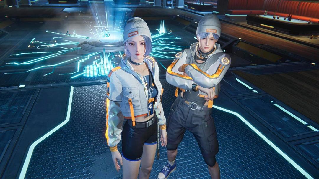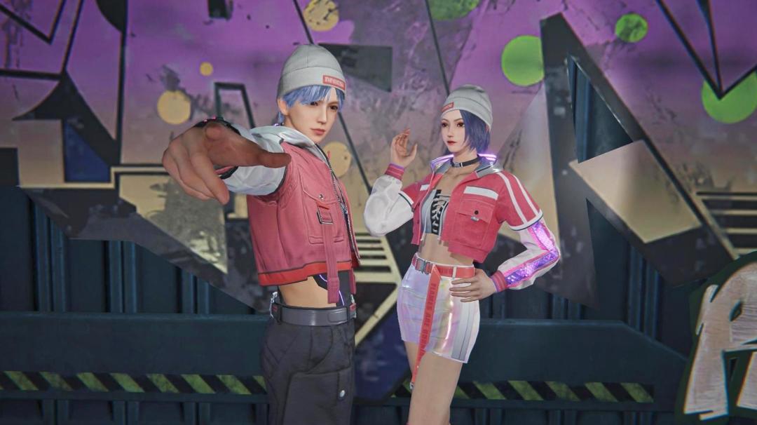 把一切交给音乐,自由律动。【潮酷前线】男女都戴上潮人必备的毛线帽,男装配有别具一格的粉白色choker,运动风的镭射背心,休闲青春。女装为甜酷风格,外套与裙子都有镭射炫光,背后可爱的机甲白兔也在随着音乐跳舞。