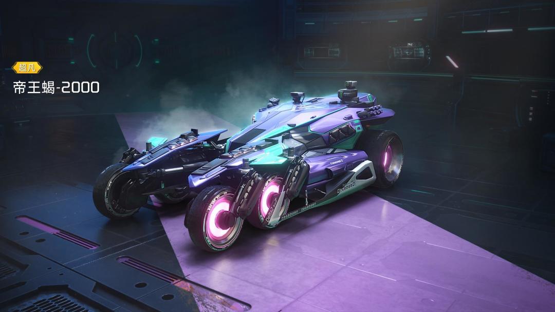 超凡载具【帝王蝎】的设计灵感来源于体型庞大的统治者帝王蝎,车型为改版后驱跑车。帝王蝎-2000以流光紫覆盖车身,克莱因染料点缀,绿色荧光犹如毒液一般充满危险;而帝王蝎-5000则以橙色重新涂装,行驶在尖叫戈壁,仿若破土而出蓄势待发的毒蝎。