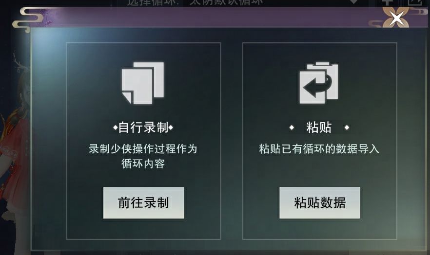 如果少侠在外部复制了他人分享的循环数据,点击“粘贴数据”即可导入,而“自行录制”功能将会传送少侠到指定场景中,自行录制循环内容。