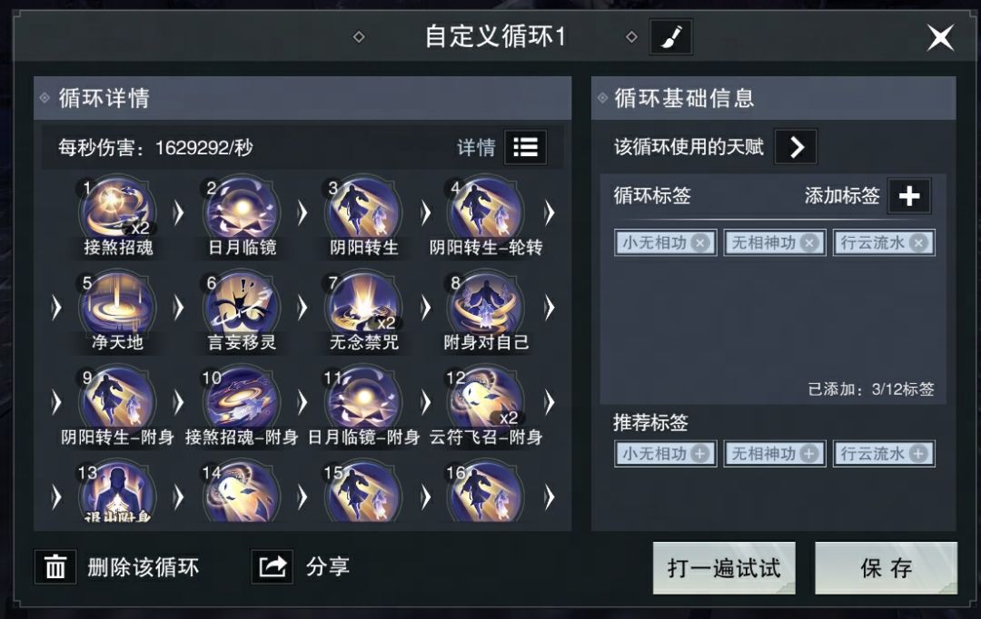 在这里可以查看录制好的技能顺序、天赋信息,想要分享经验的少侠还可以给录制好的循环添加一些标签,来提醒使用此循环的其他少侠要注意携带哪些关键技能哦~