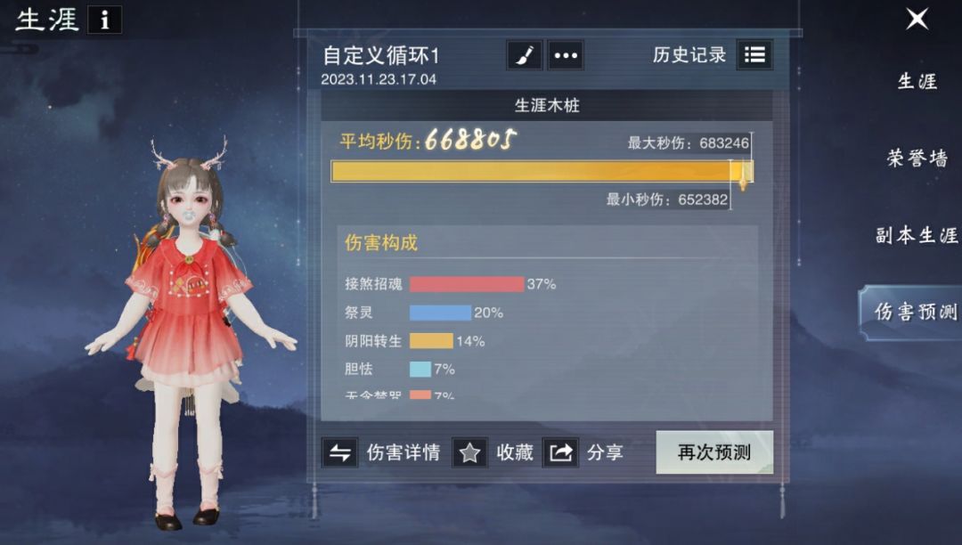 最终,我们就可以得到模拟的结果啦!每次模拟会使用预设好的技能循环打5轮,结果页面会展示少侠此次模拟的单轮最高伤害、单轮最低伤害与每轮的平均伤害。