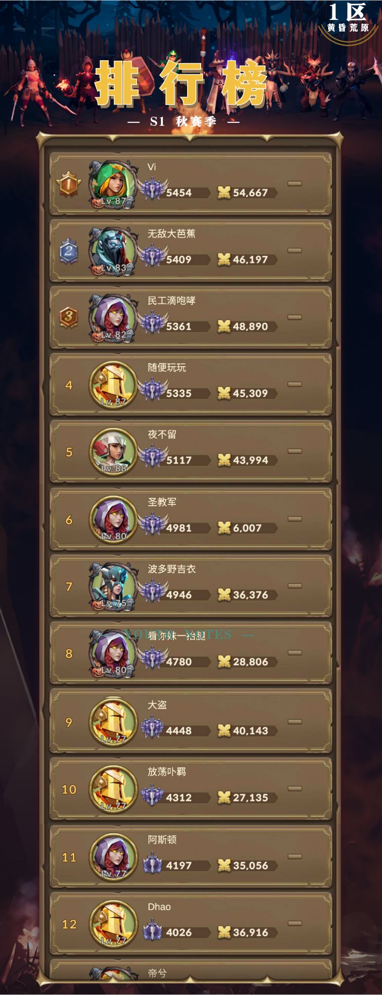 【S1·秋赛季】前12强名单: