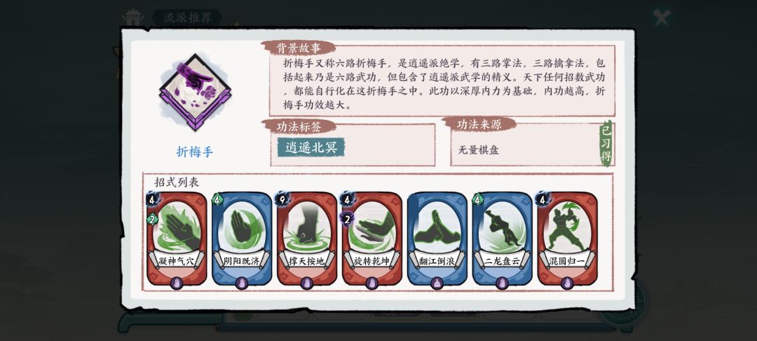 混圆归一:造成伤害,并抽一张牌,是折梅手的主要抽牌招式。这也是折梅手要比白虹掌和北冥神掌要好的一点,有一个稳定的抽牌机制。