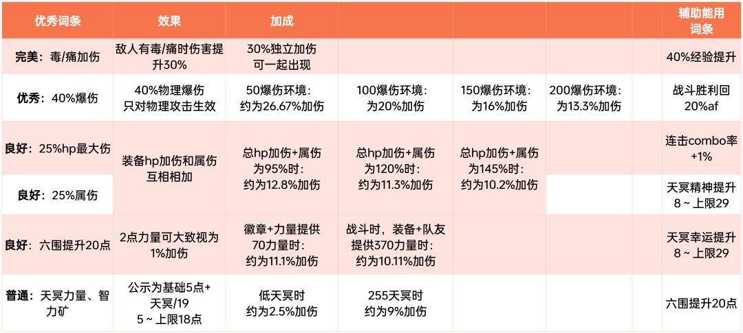 40%爆伤的加成根据总爆伤数值变化很大,但堆到200爆伤也能有13%加伤,因此定为优秀词条