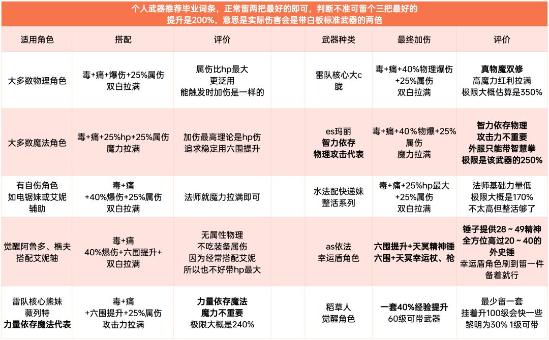 ①前为武器介绍、试炼词条分析;中为攻击力和魔力对加伤的影响