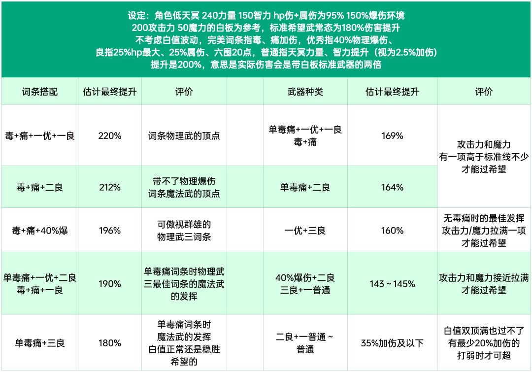 ②如果不想挨个算词条加伤的,可看该图简单判断词条的大致水平,然后结合攻击力、魔力表算最终加伤